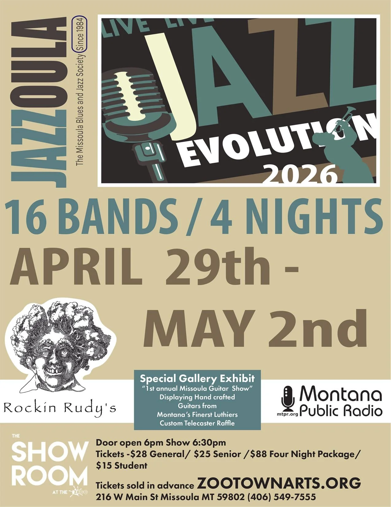 Montana’s premiere jazz festival since 1984, presents the 2026 spring concert series April 29th-May 2nd at the ZACC. Four nights of Montana’s finest jazz artists celebrating 22 years of jazz in the Missoula community. The festival presents 20+ jazz combos, septets, big bands, vocalists, and student groups giving the audience a chance to experience Montana’s eclectic and diverse jazz performers including musicians and vocalists of all ages and backgrounds from around the state. Anchored in Missoula, Montana, Jazzoula is a 501(c)(3) nonprofit organization sharing extraordinary live jazz performances to inspire discovery and build community. Check out this year’s amazing line-up: